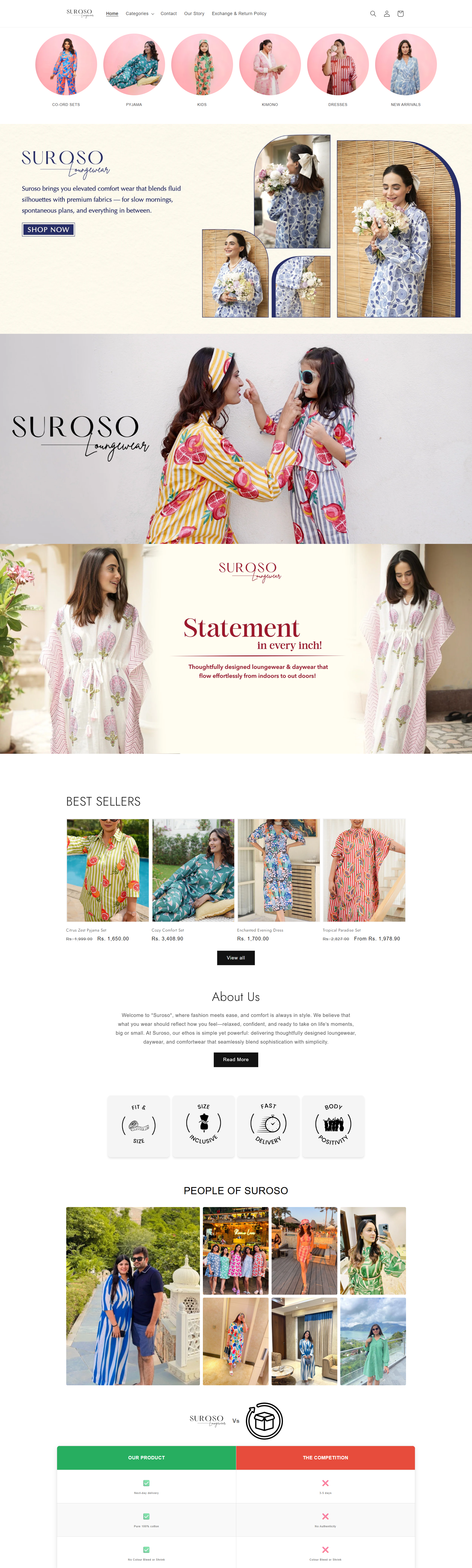 Welcome to *Suroso*, where fashion meets ease, and comfort is always in style. We believe that what you wear should reflect how you feel—relaxed, confident, and ready to take on life’s moments, big or small. At Suroso, our ethos is simple yet powerful: delivering thoughtfully designed loungewear, daywear, and comfortwear that seamlessly blend sophistication with simplicity. From cozy sleepwear that wraps you in serenity to versatile daywear that keeps you looking effortlessly chic, and vacation-ready pieces that celebrate your wanderlust, every outfit we create embodies our philosophy of *comfort with flair*. We understand that modern lifestyles demand flexibility, and our collections are crafted to ensure you’re as comfortable on the couch as you are out conquering the day. Suroso is more than just a brand; it’s a celebration of everyday wins—whether it’s relaxing at home, exploring new horizons, or enjoying cherished moments with loved ones. Each piece is thoughtfully tailored to provide a perfect balance of style, quality, and functionality. Our designs are rooted in contemporary trends yet are timeless enough to become staples in your wardrobe. Using premium, breathable fabrics and mindful craftsmanship, we ensure that you feel as good as you look. At Suroso, we don’t just create clothing; we curate experiences—enabling you to *live your best life, one outfit at a time*. Step into the world of Suroso and discover the joy of effortless style and unparalleled comfort. Because you deserve to feel at ease, wherever life takes you.